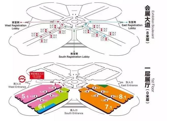▲ 整個(gè)展館分為三層,一層展館(0M層)和二層展館(16M層)為展廳,中間的會(huì)展大道層(8M層)為簽到點(diǎn)和會(huì)議室。